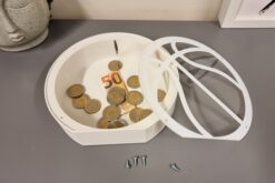 Pinigų išėmimas. Taupyklei prisipildžius tereikia atsukti varžtelius atsuktuvu, nuimti dangtelį ir išberti monetas ir kupiūras. Uždėjus dangtelį atgal, galima taupyti kitai svajonei!