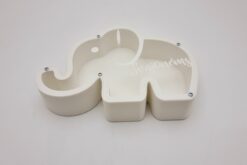 Taupyklė baltas drambliukas pagaminta 3d spausdintuvu iš PLA plastiko. Paveiksliukas atspausdintas UV printeriu.