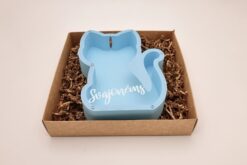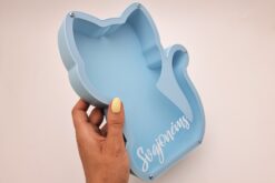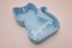 Taupyklė žydras kačiukas pagaminta 3d spausdintuvu iš PLA plastiko. Paveiksliukas atspausdintas UV printeriu.