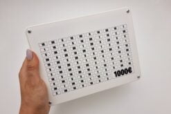Taupyklė su skaičiais – puiki dovanos idėja gimtadienio ar kita proga. Galime užrašyti bet kokį tekstą. Taupyklės esmė tokia, kad kiek pinigų įdedi, tokį skaičiuką užbrauki. Užbraukus visus skaičiukus, būsite sukaupę 1000 eur. Jeigu reikia kitos sumos rašykite el paštu info@goltas.lt