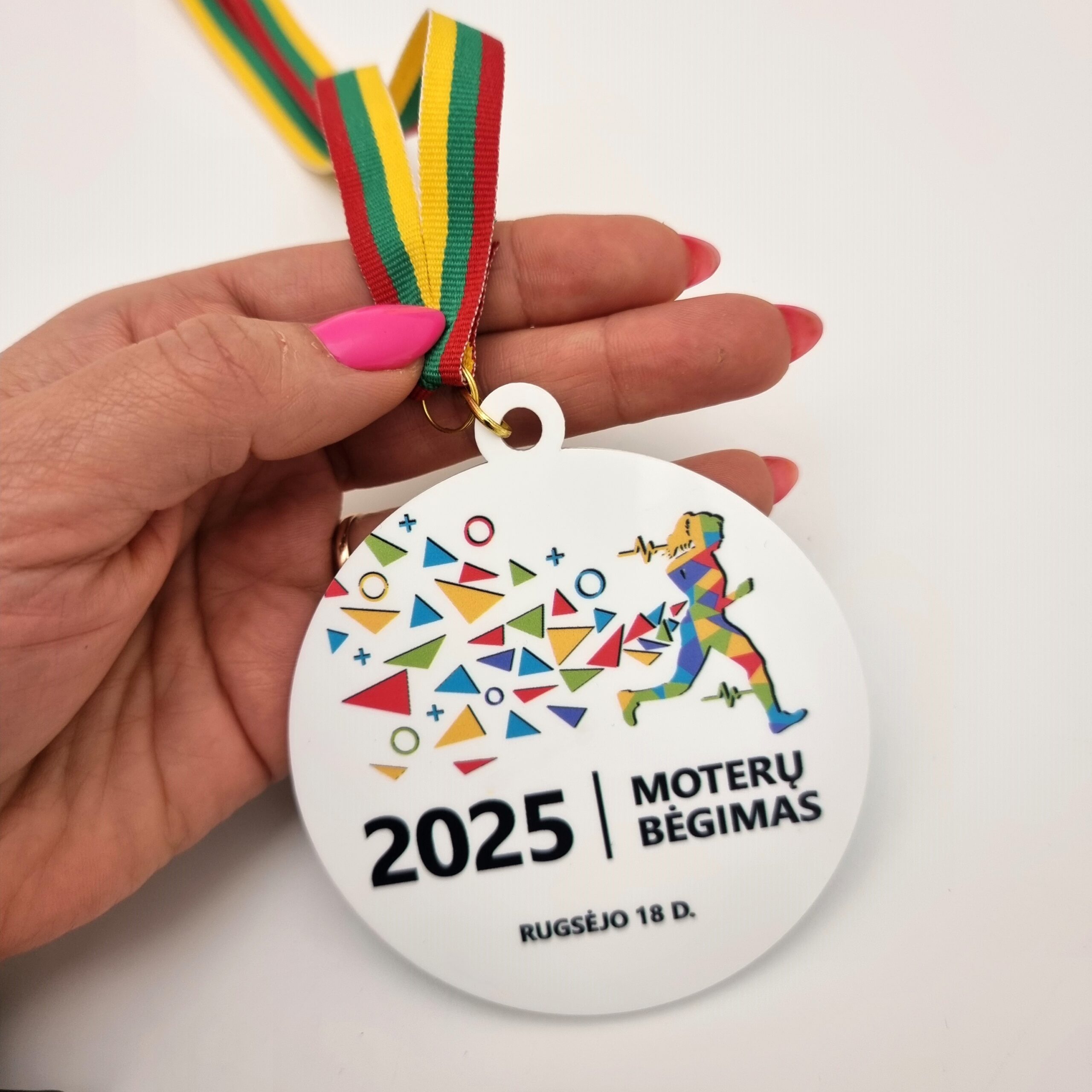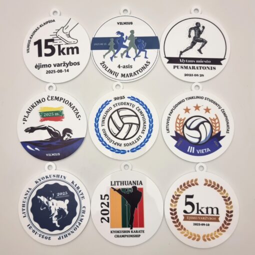 Sportiniai medaliai renginiams – kiekvienas medalis kuriamas individualiai, atsižvelgiant į kliento pasirinktos sporto šakos ypatybes. Dizainas atspindi sporto esmę, išryškindamas ją ryškiomis spalvomis ir simboliais, kurie įprasmina sportininkų laimėjimus bei varžybų dvasią. Prieš gaminant medalius, atsiunčiame medalio projektą galutiniam suderinimui. Sporto medaliai pagaminti iš 3 mm storio plastiko, paveiksliukas atspausdintas UV printeriu.