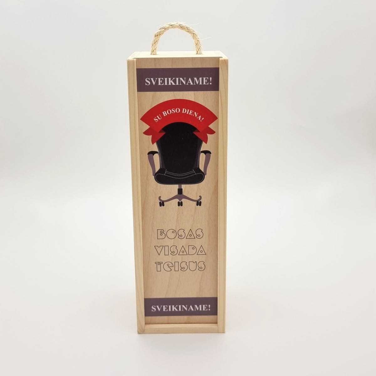 Vyno dėžė Bosui pagaminta iš spygliuočių medienos, vidus užpildytas medžio drožlėmis. Vyno dėžė bosui – smagi ir praktiška dovana. Dangtelis pagamintas iš faneros, atspausdintas uv spausdintuvu.