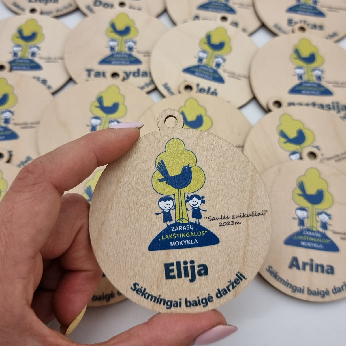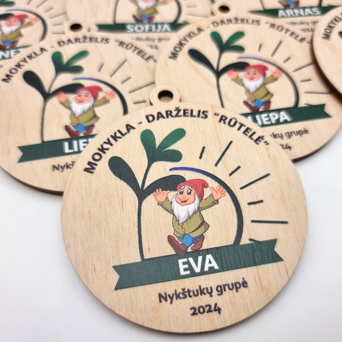 Šis 7 x 7,8 cm dydžio medinis medalis – unikalus ir personalizuotas suvenyras darželio išleistuvių proga. Medaliai gaminami su pasirinktu darželio logotipu, simbolika ar grupės pavadinimu. Personalizuojami vardu, norima fraze bei ugdymo įstaigos informacija, todėl tampa ypatinga atminimo dovana vaikams.