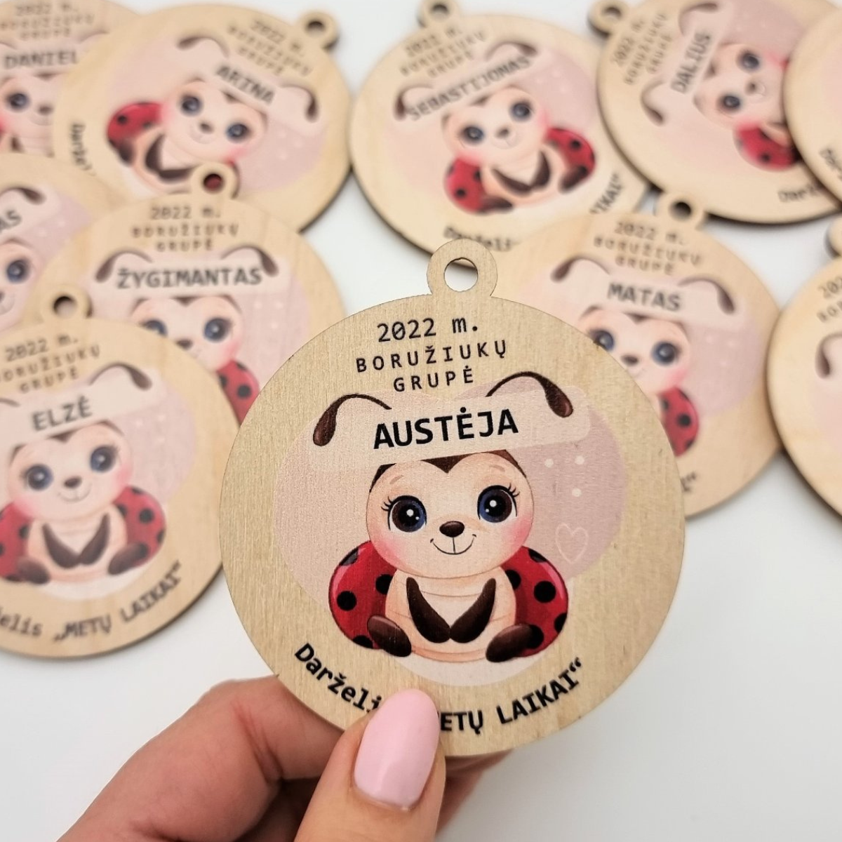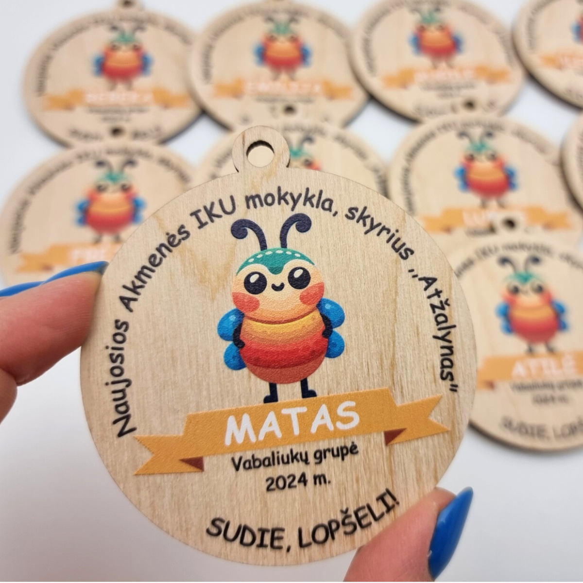 Šie 7 x 7,8 cm dydžio mediniai medaliai su žaismingais piešiniais – puikus prisiminimas vaikams, baigusiems priešmokyklinę grupę! Medaliai personalizuojami vardu, darželiu/mokykla ir norima fraze, todėl tampa unikaliu ir prasmingu suvenyru.