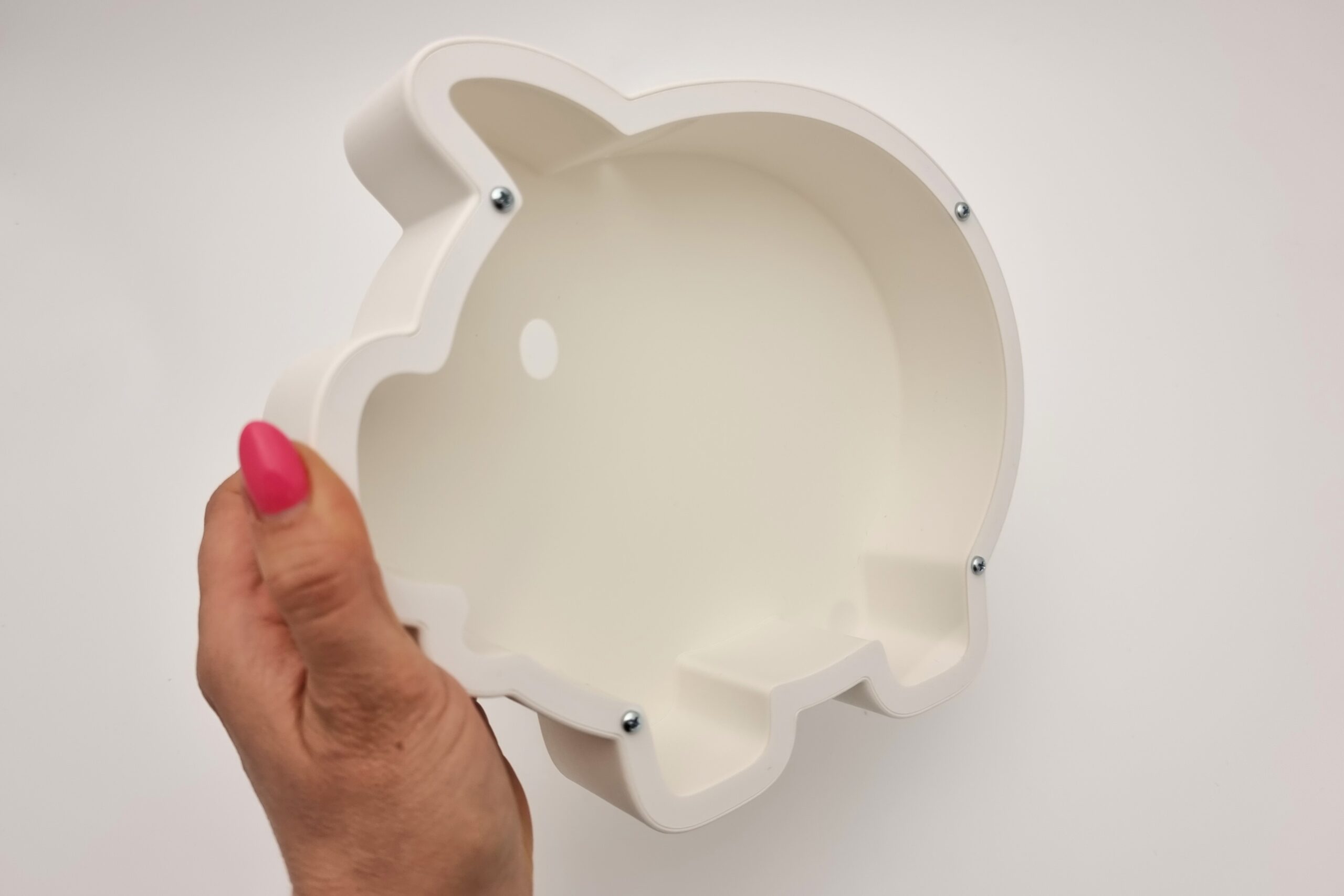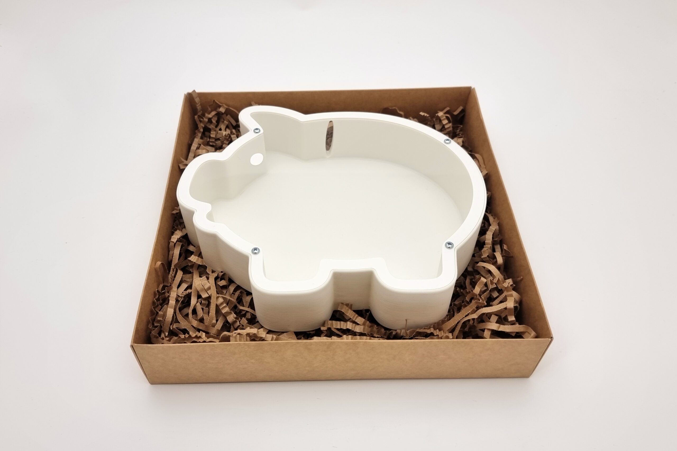 Tai šiuolaikiškas klasikinės taupyklės variantas – ji gaminama 3D spausdintuvu iš ekologiško PLA plastiko, todėl yra lengva, saugi ir patvari. Ant skaidraus dangtelio užrašome norimą vardą ar trumpą žinutę, kad kiekviena taupyklė būtų unikali ir asmeniška.