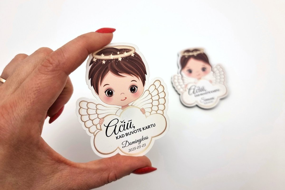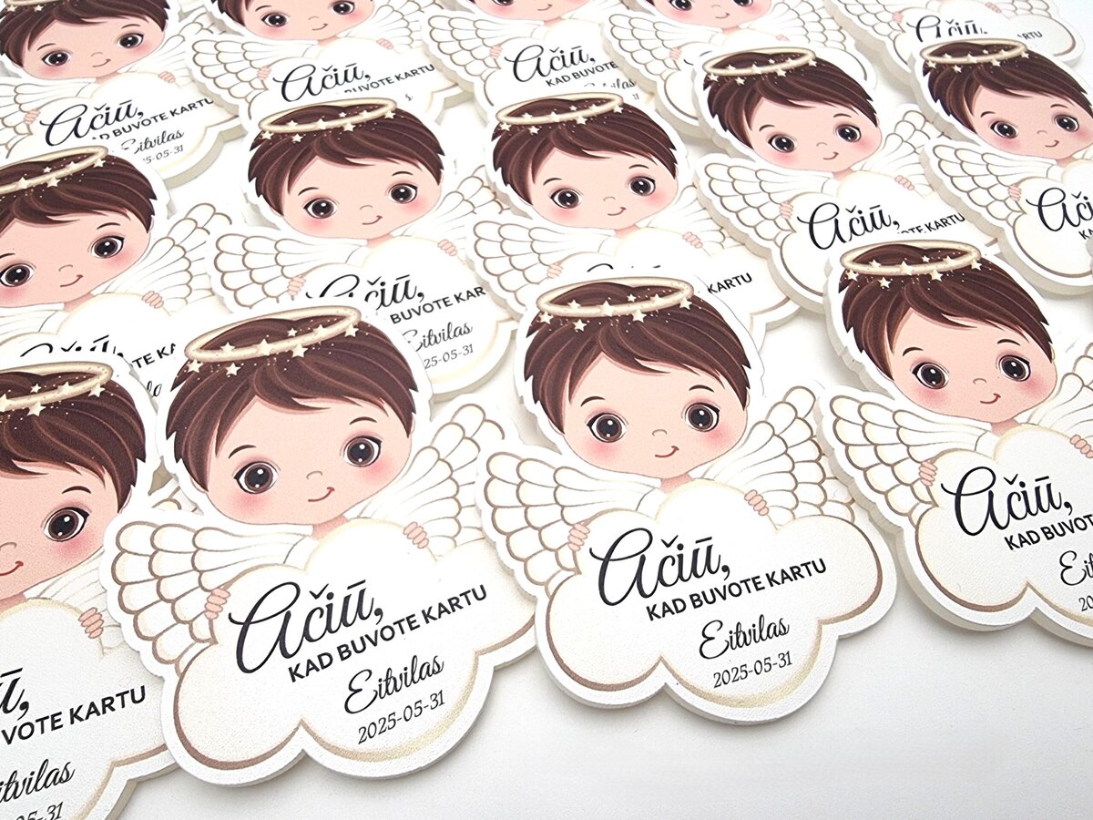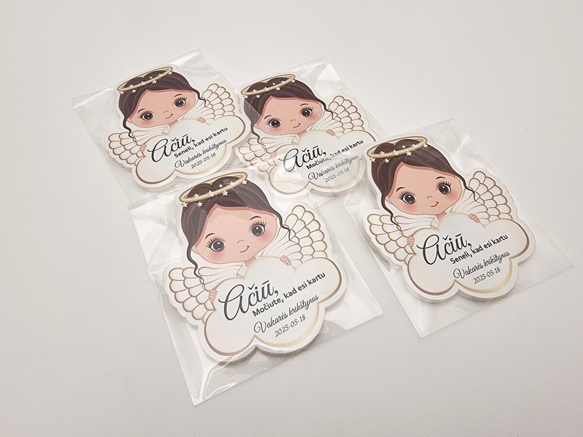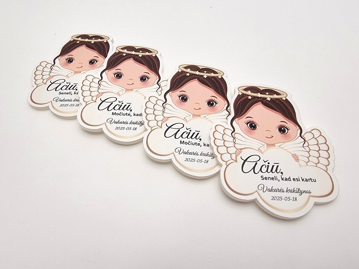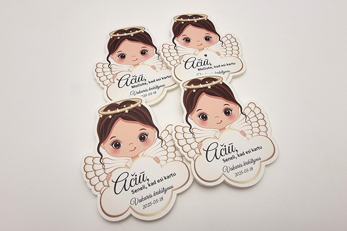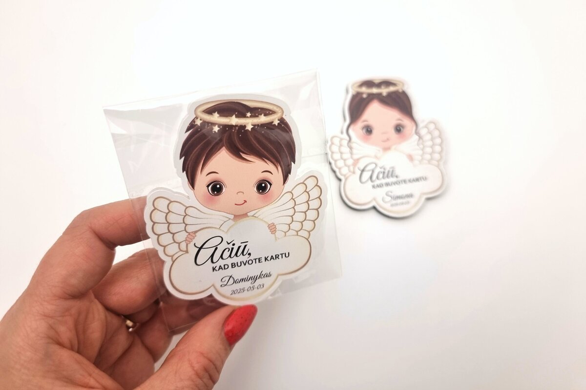 Magnetukai krikštynoms – angeliuko formos dovanėlės svečiams – tai švelni ir asmeniška padėka svečiams dalyvavusiems krikštynose. Kiekvienas magnetukas gaminamas iš aukštos kokybės balto plastiko ir dekoruojamas ryškia UV spauda.