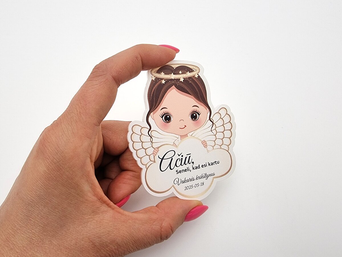 Magnetukai personalizuojami jūsų pasirinktu tekstu – ant debesėlio galima atspausdinti vaiko vardą, krikštynų datą ar padėkos žinutę. Šie personalizuoti magnetukai krikštynoms su angeliuko iliustracija yra ne tik dovanėlė, bet ir šiltas prisiminimas. Angeliuko formos magnetukai krikštynoms gaminami individualiai, todėl puikiai atspindi Jūsų šventę.