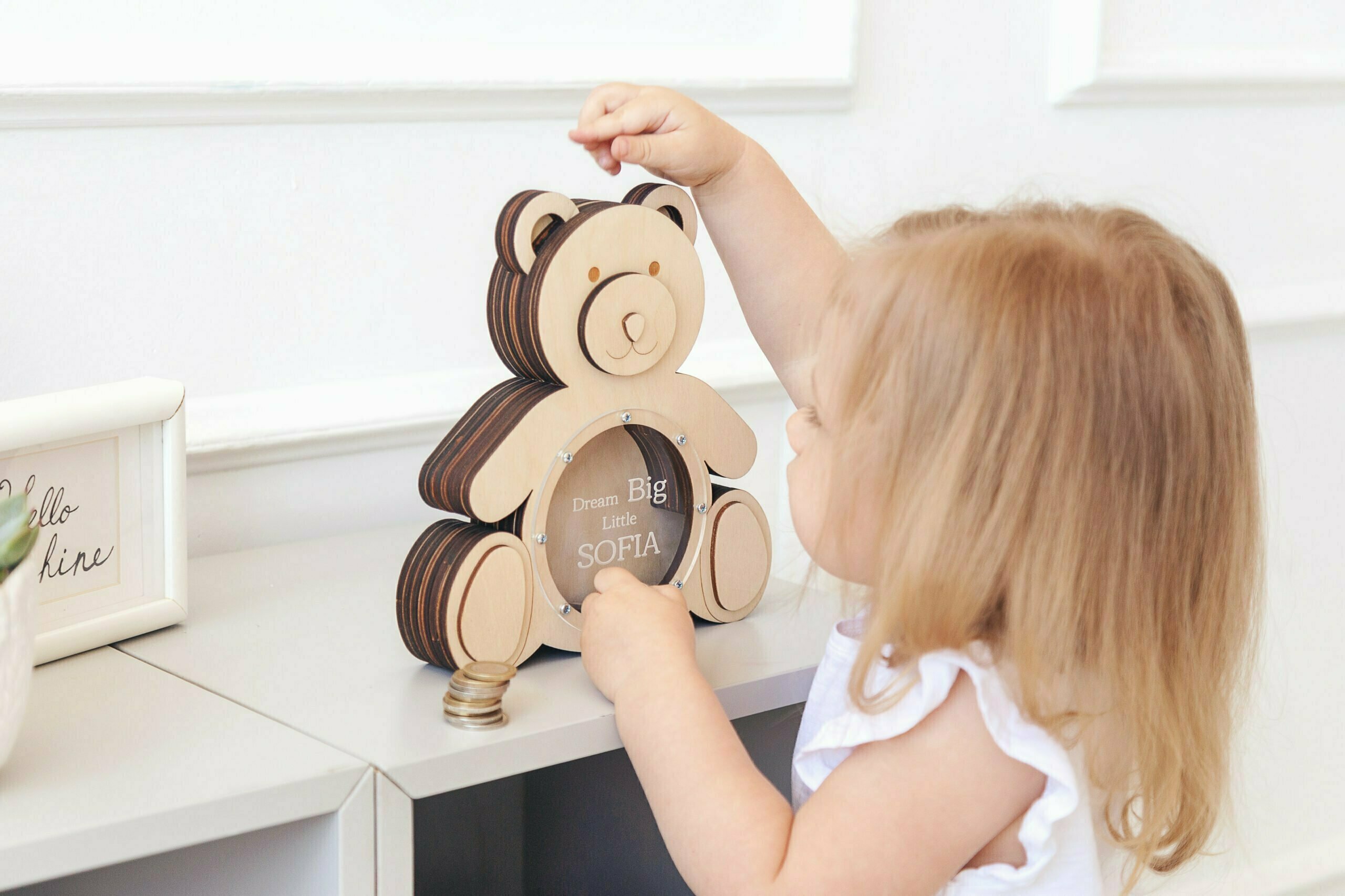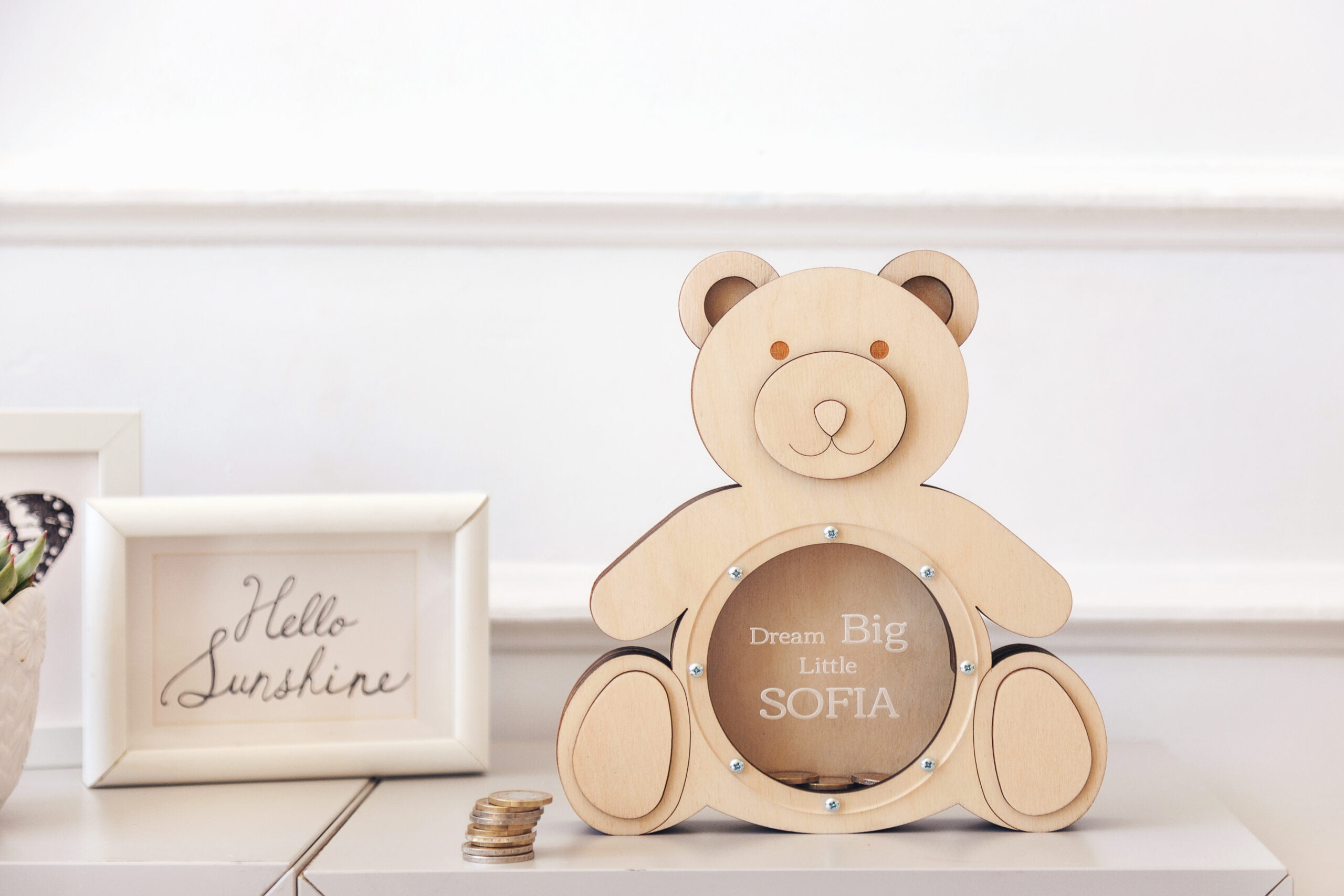 Medinė taupyklė meškinas- puiki dovanos idėja mergaitei ar berniukui gimtadienio, krikštynų ar kita proga. Medinė taupyklė meškinas tikrai patiks kiekvienam vaikui.