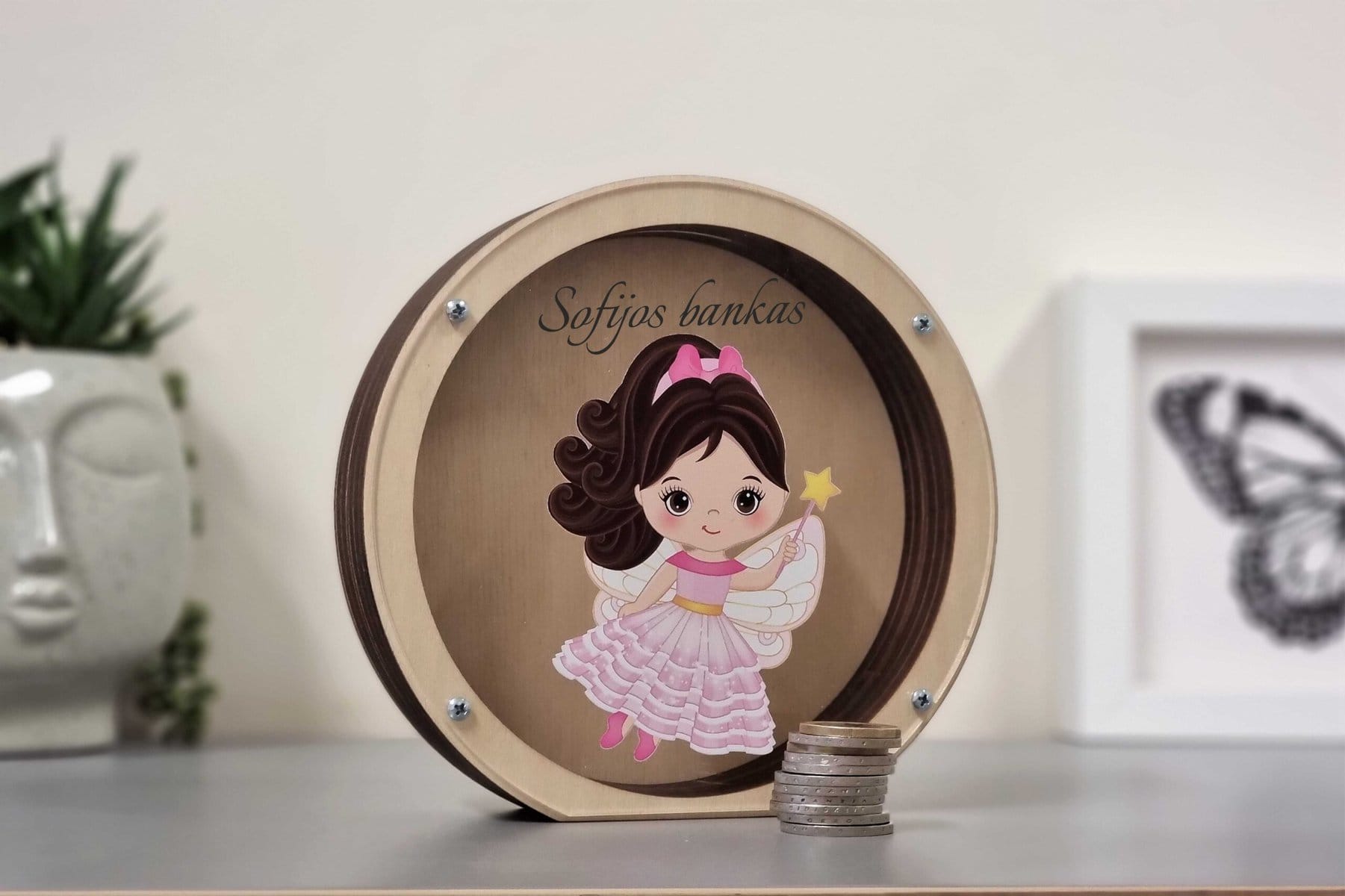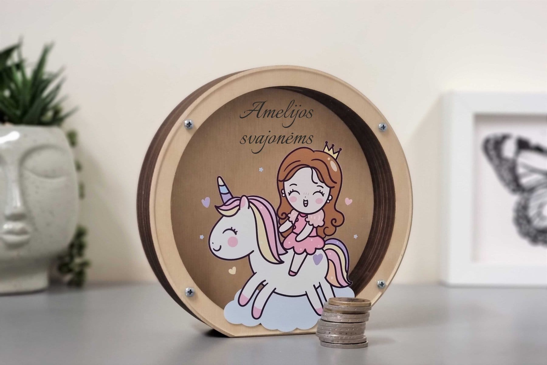 Ant skaidraus plastikinio dangtelio galime užrašyti vaikučio vardą ar kitą tekstą. Po užsakymo pateikimo, mes visada atsiunčiame taupyklės su Jūsų tekstu projektą patvirtinimui.