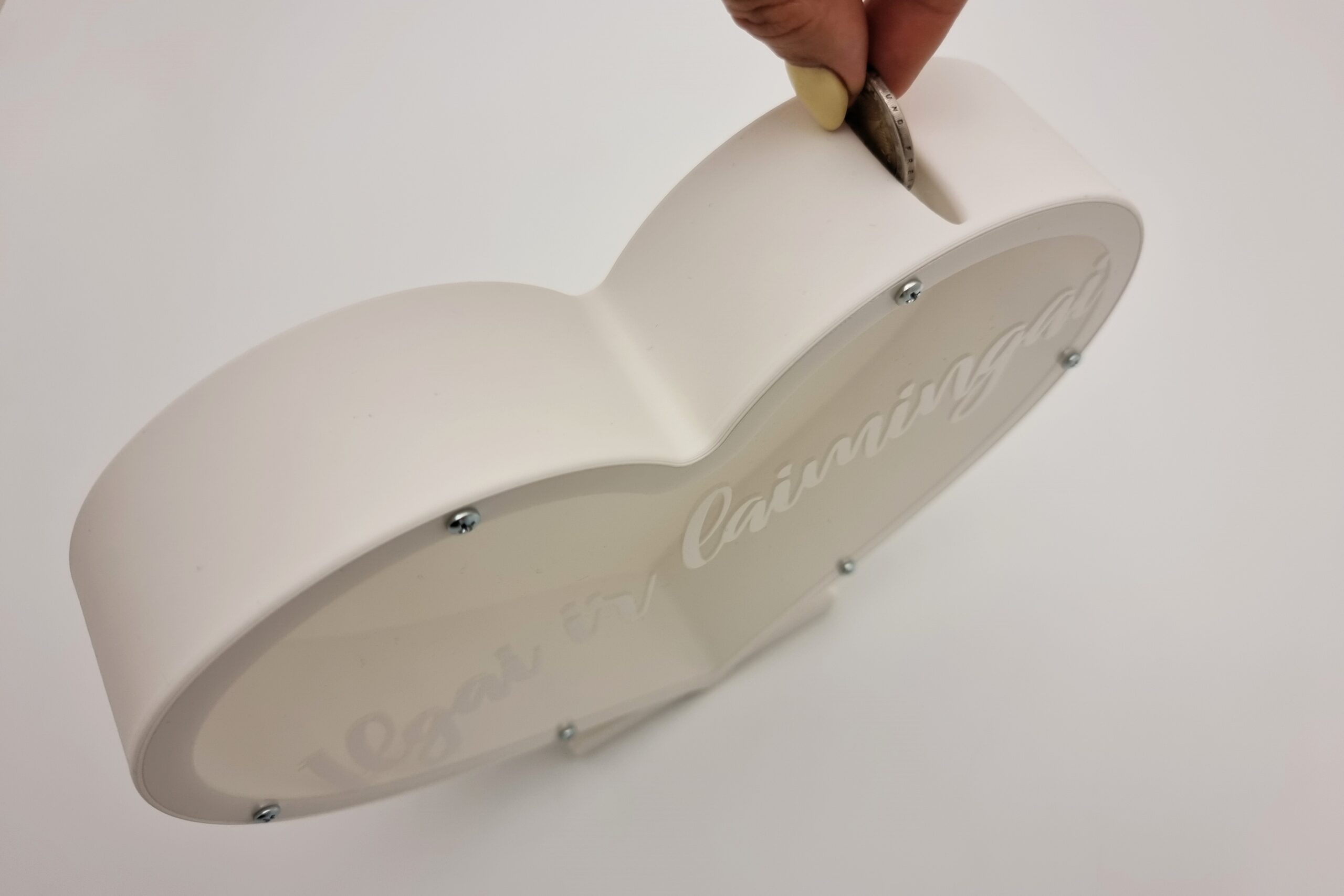 Pinigų išėmimas. Taupyklei prisipildžius tereikia atsukti varžtelius atsuktuvu, nuimti dangtelį ir išberti monetas ir kupiūras. Uždėjus dangtelį atgal, galima taupyti kitai svajonei!
