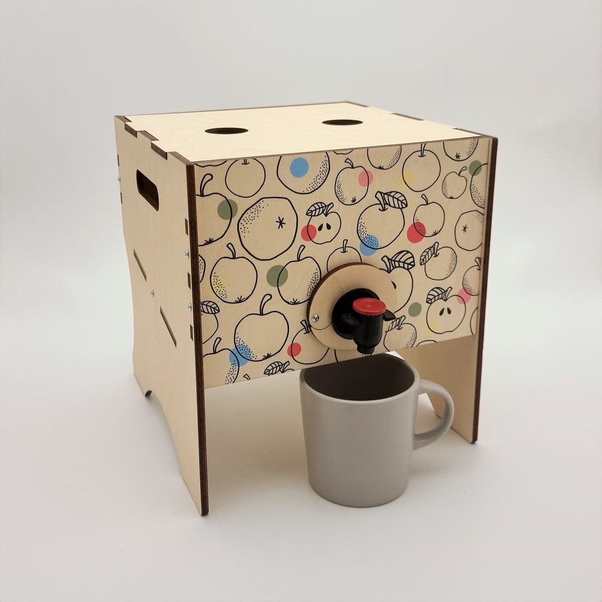 Medinė dėžutė sultims skirta dėti 3 arba 5 litrų sulčių maišelį su kraneliu. Dėžutė pristatoma nesurinkta. Prekės komplektą sudaro medinės detalės, atsuktuvas ir varžteliai, reikalingi dėžutės surinkimui.