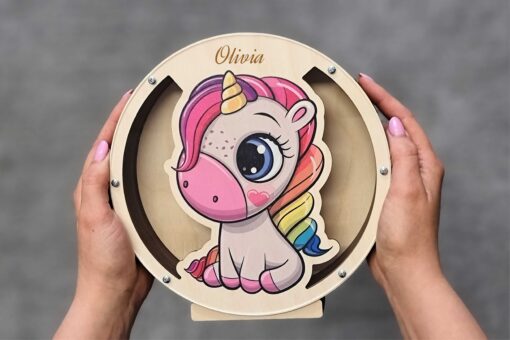 Medinė taupyklė vienaragis – stilinga dovanos idėja vaikui gimtadienio, krikštynų ar kita proga. Medinė taupyklė vienaragis tikrai patiks kiekvienam vaikui!