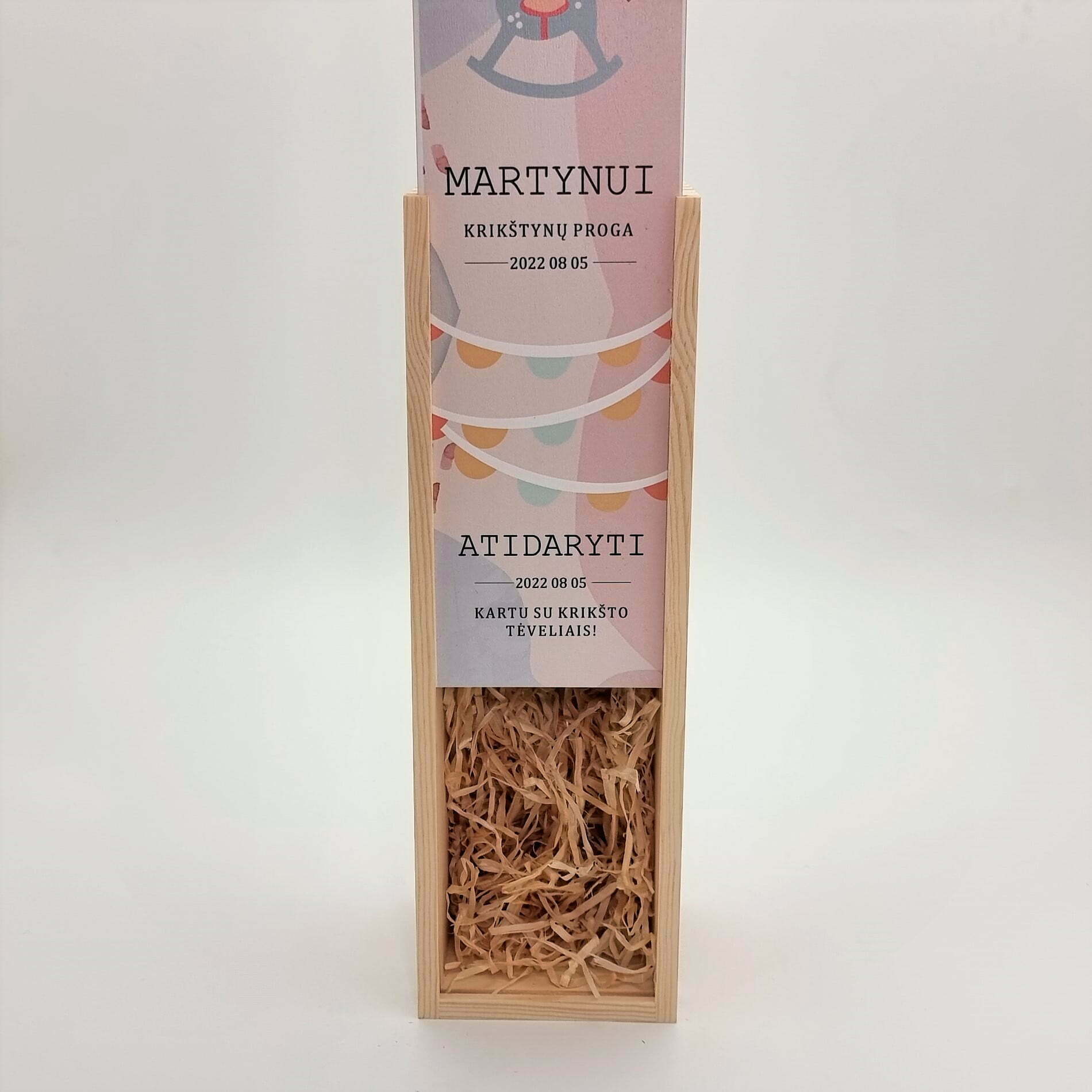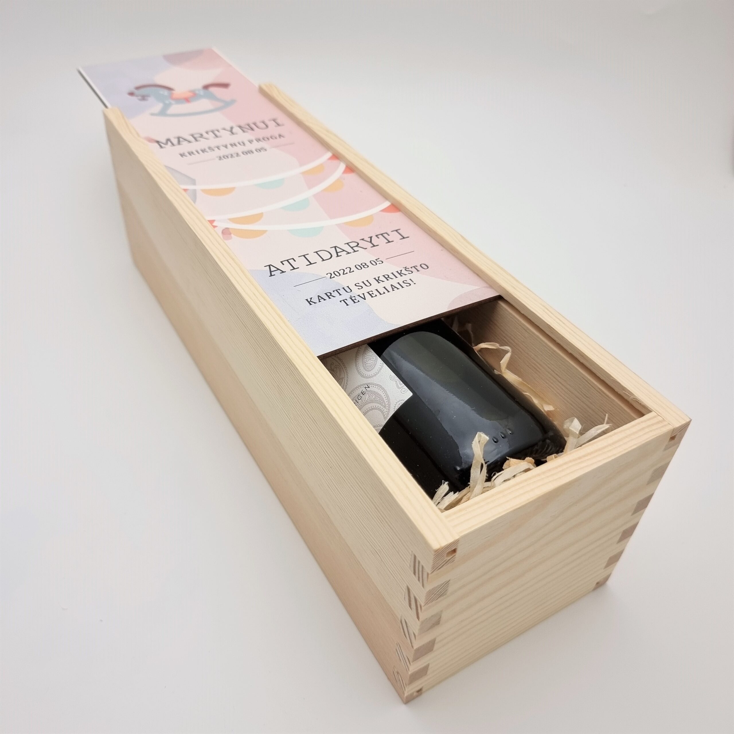 Medinė vyno dėžė krikštynoms, pagaminta iš spygliuočių medienos, vidus užpildytas medžio drožlėmis. Dangtelis pagamintas iš faneros, atspausdintas uv spausdintuvu. Norimą tekstą įrašykite į langelį.