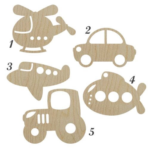 Medinės dekoracijos Transportas išpjautos lazeriu iš 3 mm faneros. Galima pasirinkti 10 arba 15 cm dydžio.