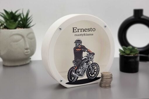 Ant skaidraus plastikinio dangtelio galime užrašyti vaikučio vardą ar kitą tekstą. Po užsakymo pateikimo, mes visada atsiunčiame taupyklės su Jūsų tekstu projektą patvirtinimui.