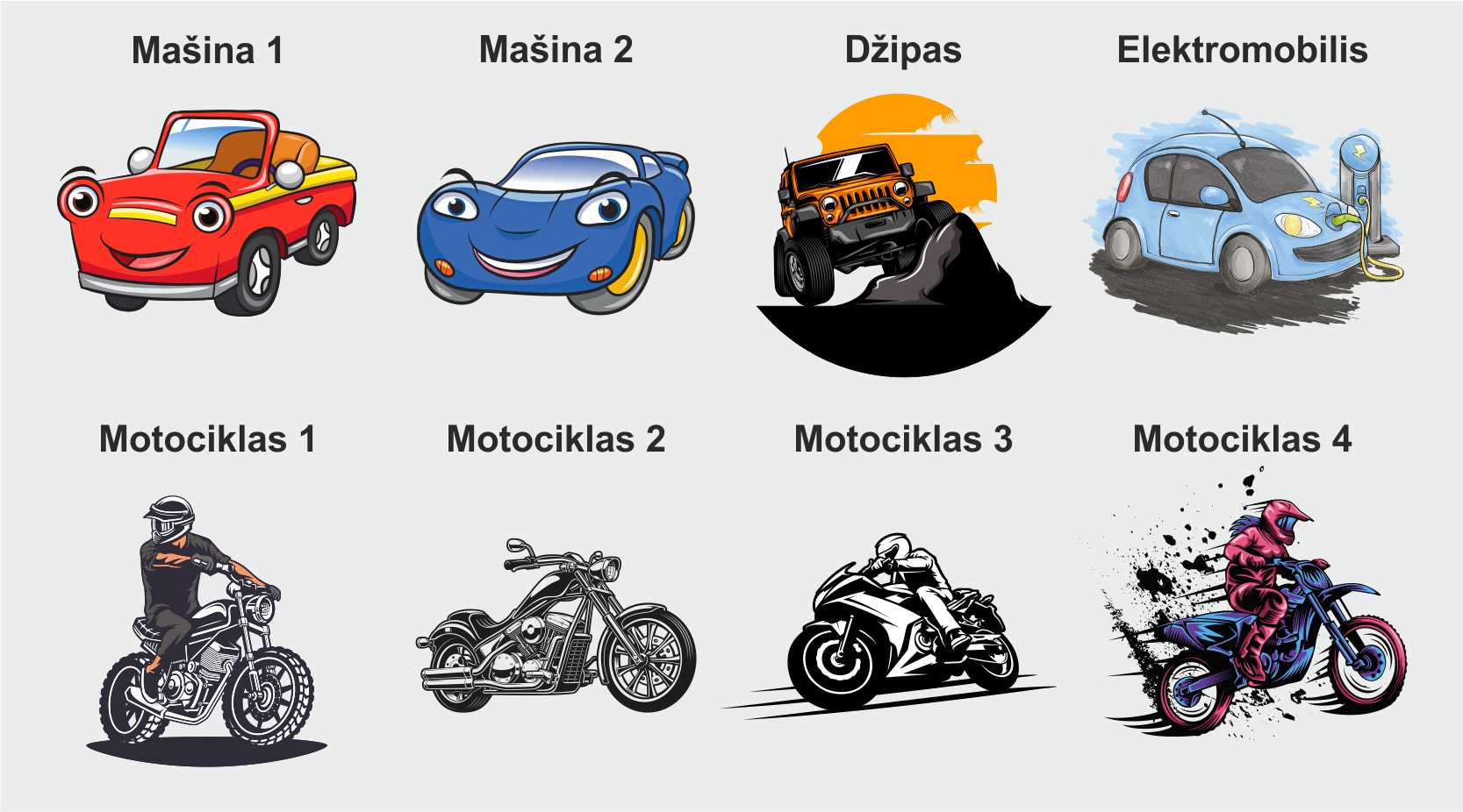 Mašina1, Mašina2, Džipas, Elektromobilis, Motociklas1, Motociklas2, Motociklas3, Motociklas4