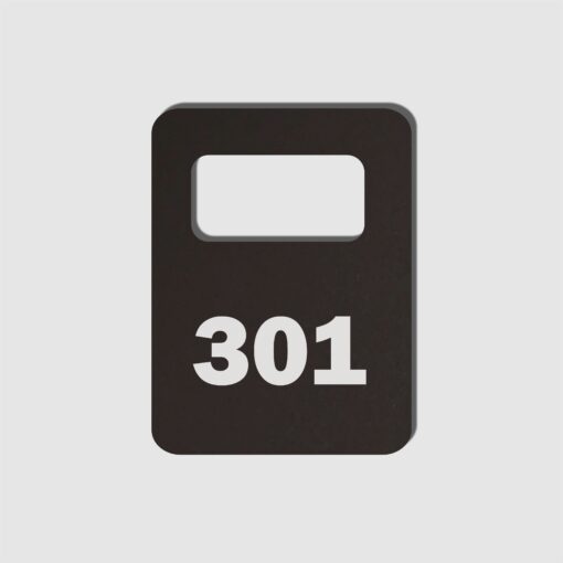 Juodas matinio plastiko rūbinės numeriukas su UV spauda – individualus dizainas!